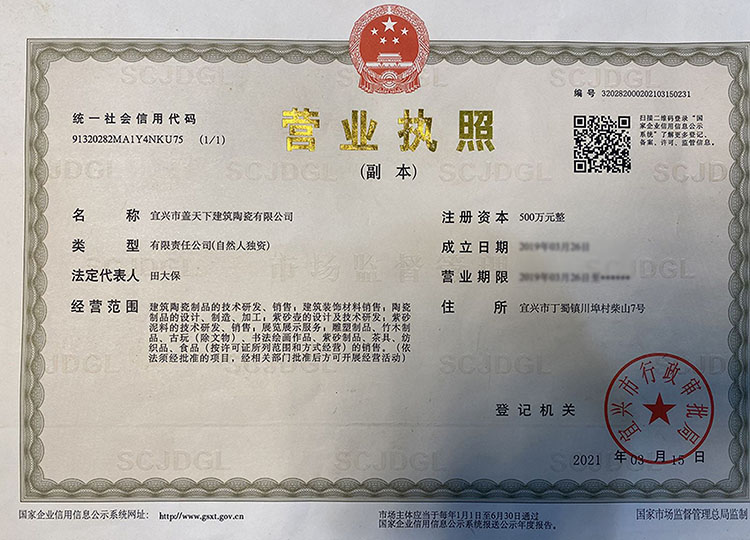 宜興市蓋天下建筑陶瓷有限公司年生產各式仿古建磚瓦約三千萬余件,其生產制作和仿唐宋、明清及漢代風格的各類龍吻、走獸、飛禽和瓦當等產品,具有時代感強,形象逼真等特點。產品系列利用當地特有的紫砂陶土和優質粘土,經科學配料與特殊加工處理制作及精心焙燒而成。仿古建磚瓦產品經機構測試和有關建筑專家、教授、學者的鑒定,其抗壓、抗折、抗凍性能與外觀質量,均已達標。客戶可以放心使用。